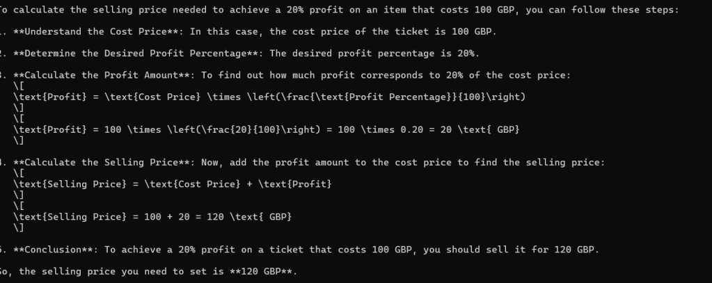 You buy a ticket for a show for 100 GBP. How much should you sell to get a 20% profit?